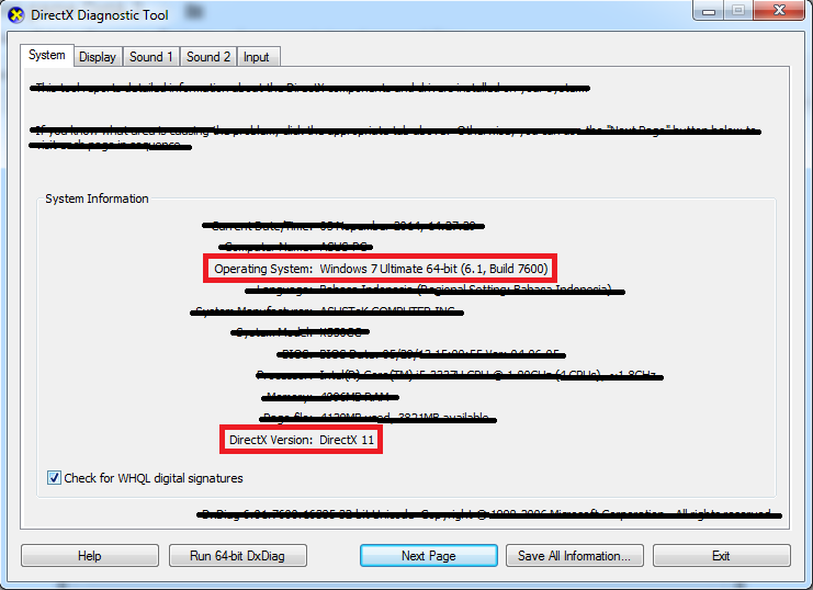 - Pada tab pertama akan menampilkan informasi Operating system komputer anda dan DirectX Version yang hasilnya dapat dibandingkan dengan system minimun yang di minta untuk DotAWorkshops Tools.