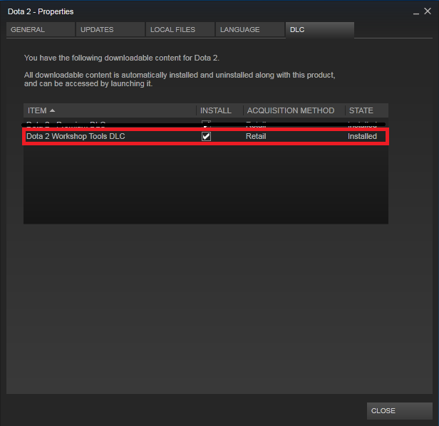 - Pada Library steam anda klik kanan pada game DotA 2, kemudian pilih Properties. Pada kolom Propertirs pilih tab DLC dan berikan tanda centang pada DotA 2 Workshop Tools DLC .