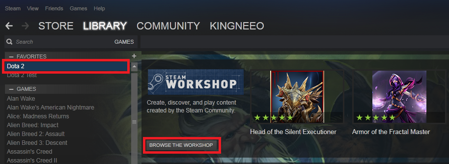 - Buka library anda dahulu, kemudian klik Dota 2 kemudian pilih tab Browse the Workshopuntuk masuk kedalam steam workshop Dota 2.