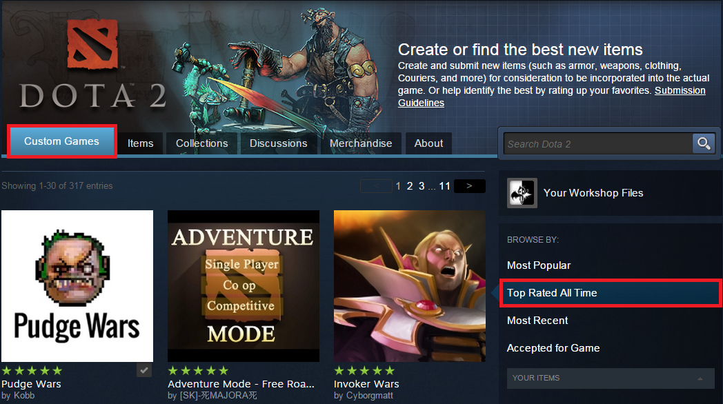 - Setelah masuk kemenu Steam workshop, klik pada bagian tab Custom Games dan pilih Top Rated All Time untuk menampilkan mini game atau custom game yang paling banyak diminati dan dimainkan.