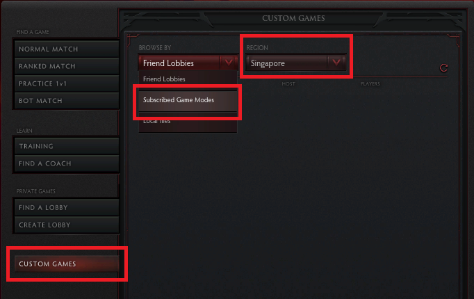 - Didalam ingame Dota 2 pilih tab Custom game yang berada dipaling bawah. Pilih region yang anda inginkan dalam hal ini perhatikan kemampuan koneksi anda. Pilih Subscribed Game Modes.