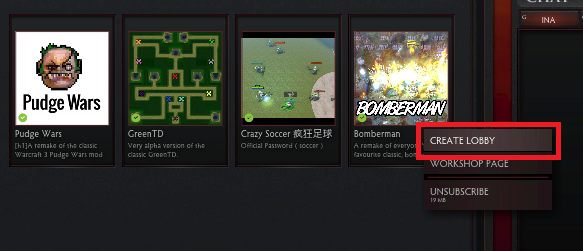 Pilih custom map yang ingin anda mainkan,beberapa game memiliki beberapa map. terkadang seperti saat halloween ada beberapa map yang tampilanya seperti Diretide (jadi sedih bro T_T diretide gak ada untuk tahun ini). - Ketika kawan anda sudah bergabung dalam mini game anda tingal menekan start game. setelah anda terhubung,teman anda akan terhubung melalui anda dan game dapat mulai dimainkan.PERHATIAN :Saat anda memulai permainan dan game di loading,Dota 2 clinet anda akan tertutup. Hal ini nampak seperti terjadi CRASHED tapi jangan khawatir. Yang anda alami bukan crash tetapi komputer anda sedang melakukan booting Dota 2 64-bit Client dan Workshop Tools anda sedang meloading mini game atau custom game yang akan anda mainkan.