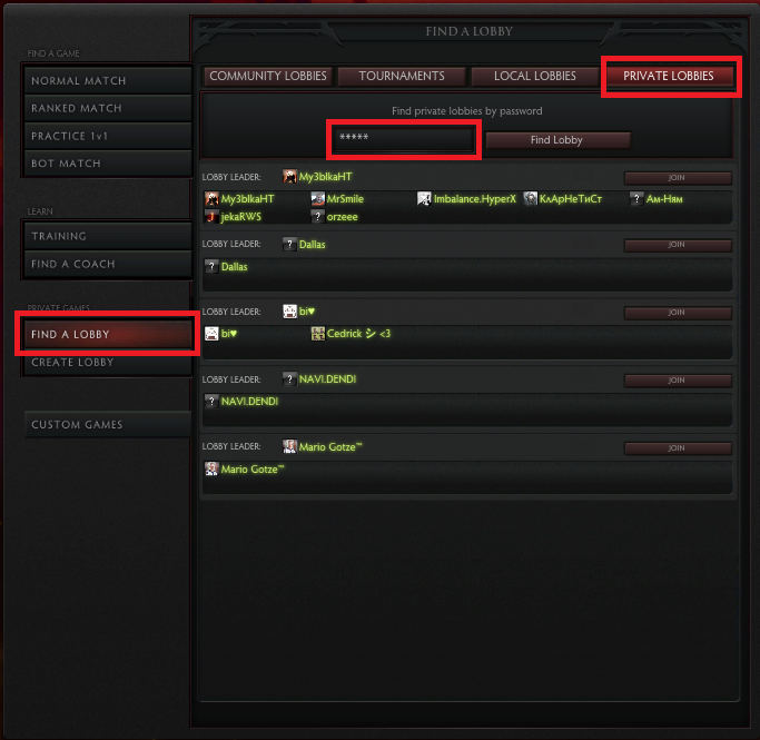 - Anda juga dapat bergabung dengan private lobby masukan password untuk menemukan custom game yang dihosting orang lain tanpa perlu menginvite atau menjadikan host tersebut sebagai teman anda terlebih dahulu.